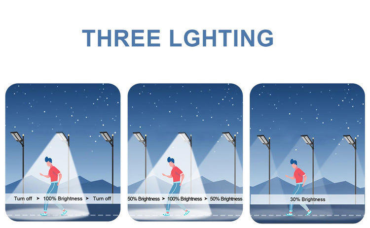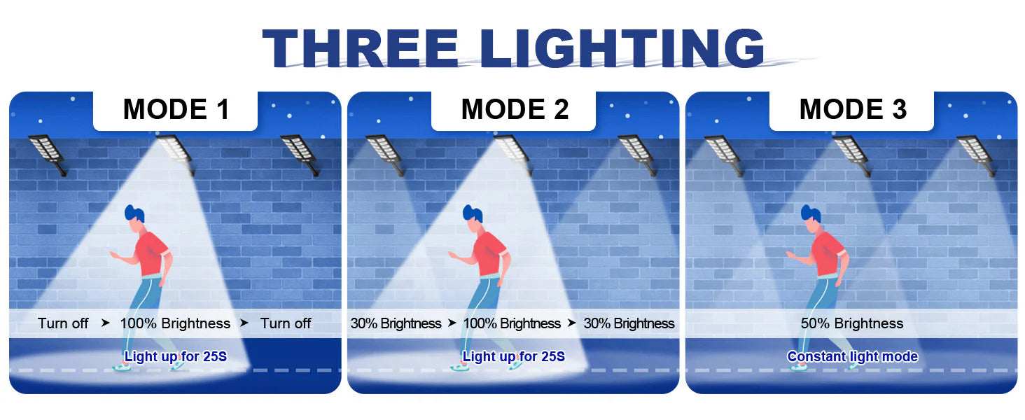 Mode2:human body induction+low light mode (the light power is 100%brightness when people pass, and power is 30% dim brightness after 20 seconds).